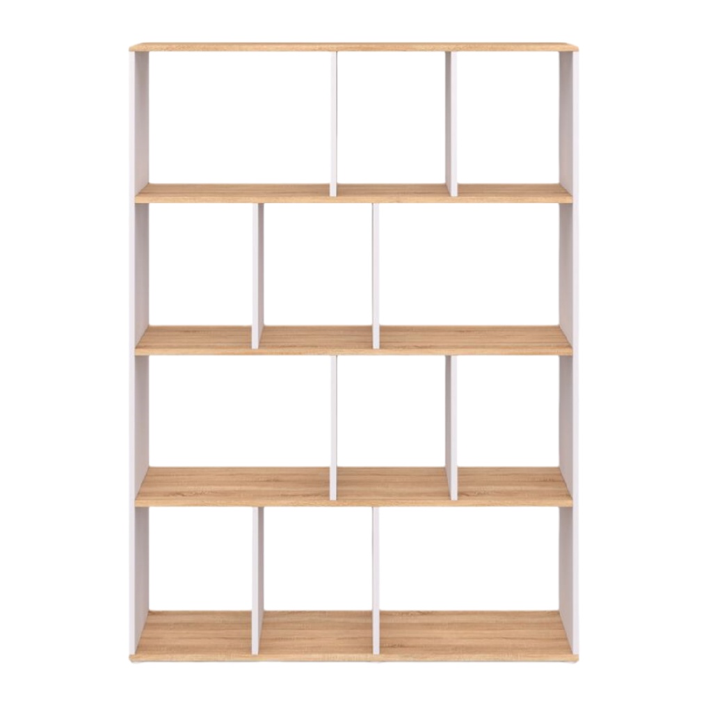 Étagère en bois et blanc moderne avec 10 compartiments de rangement.