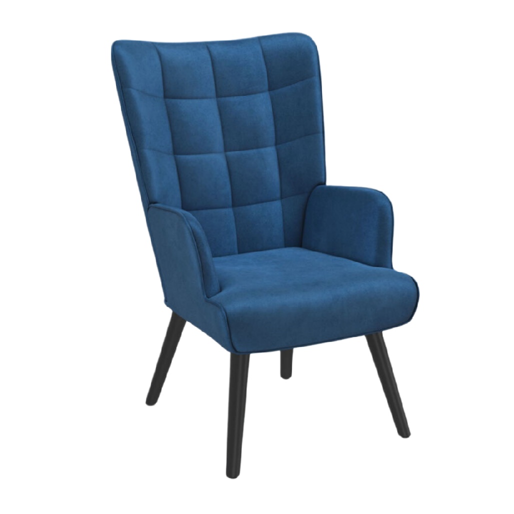 Fauteuil contemporain en velours bleu avec dossier haut et pieds en bois noir.