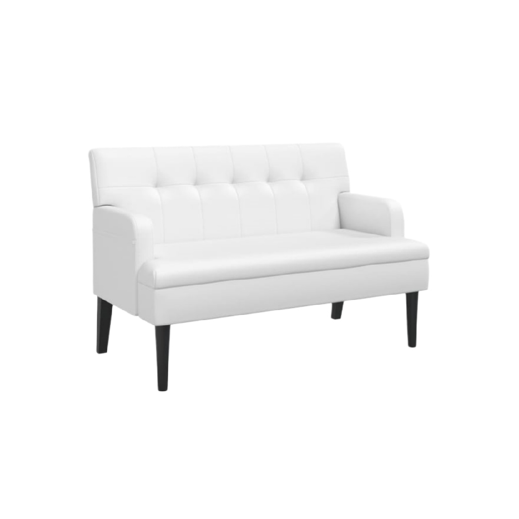 Sofa blanc en cuir synthétique avec accoudoir et pieds noirs.