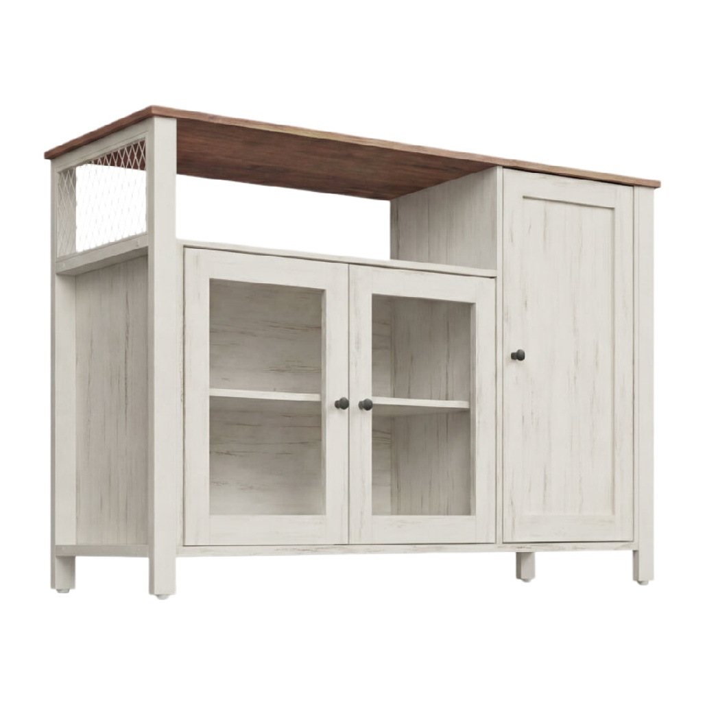 Titre technique en français : "Meuble de rangement en bois blanc avec dessus en chêne foncé et espace de rangement en verre"